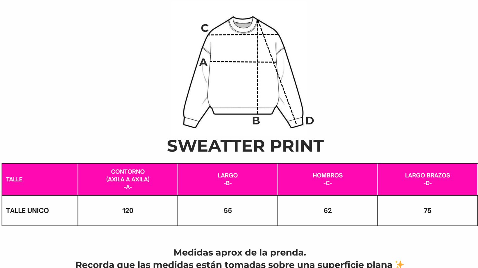 Tip: compará las medidas con un sweater tuyo para darte una mejor idea del calce