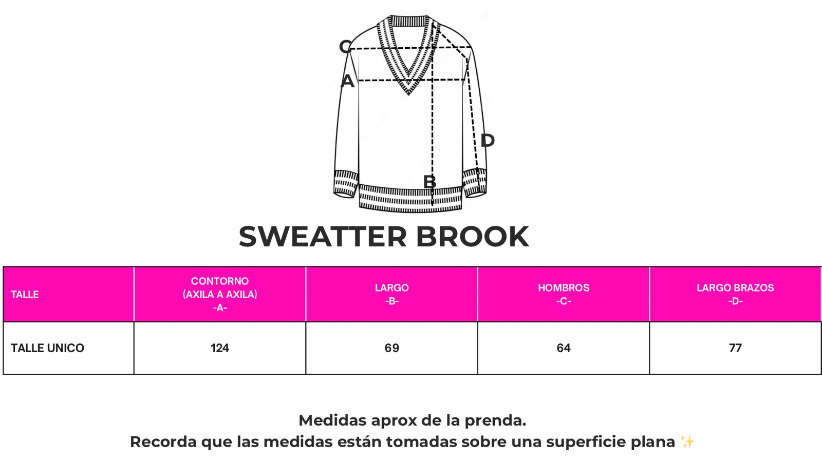 Tip: compará las medidas con un sweater tuyo para darte una mejor idea del calce